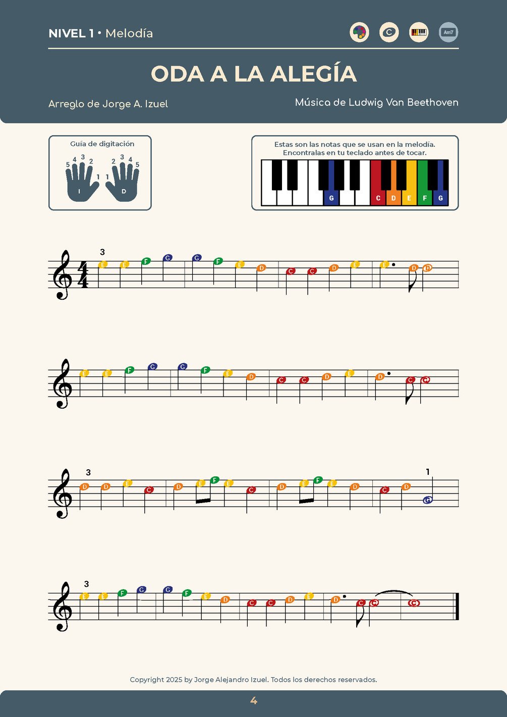 🎹 Oda a la Alegría – Cuadernillo/Partitura visual para piano (3 niveles)