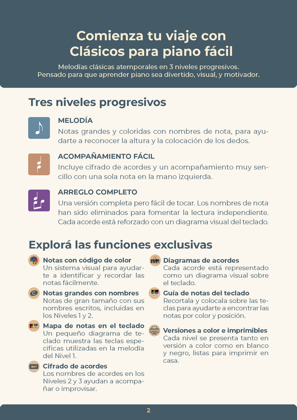 Incluye: Un PDF visual de 12 páginas con 3 niveles progresivos, versiones a color y blanco y negro, herramientas imprimibles para teclado y diagramas de acordes.